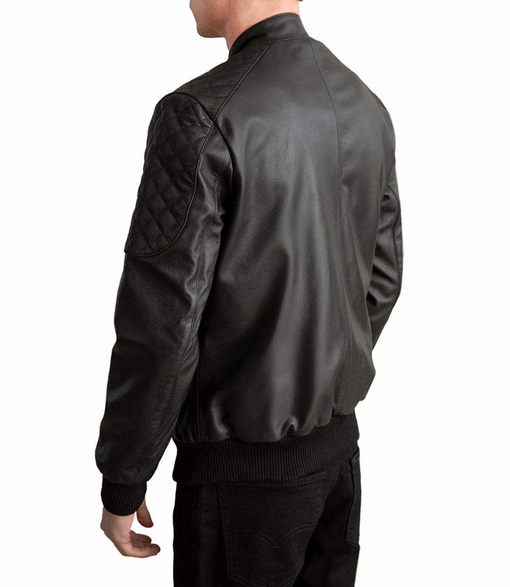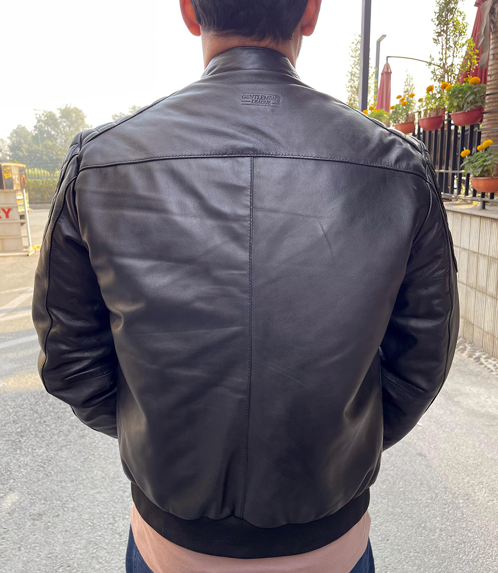 Handcrafted from premium leather with a semi-aniline finish, the Snap Button Band Bomber Jacket offers rugged sophistication and lasting durability. Its soft polyester lining ensures comfort and warmth, while the classic band collar with snap button and rib-knit cuffs add tailored structure. Designed for functionality, it features four exterior pockets and two interior ones, perfect for everyday essentials.